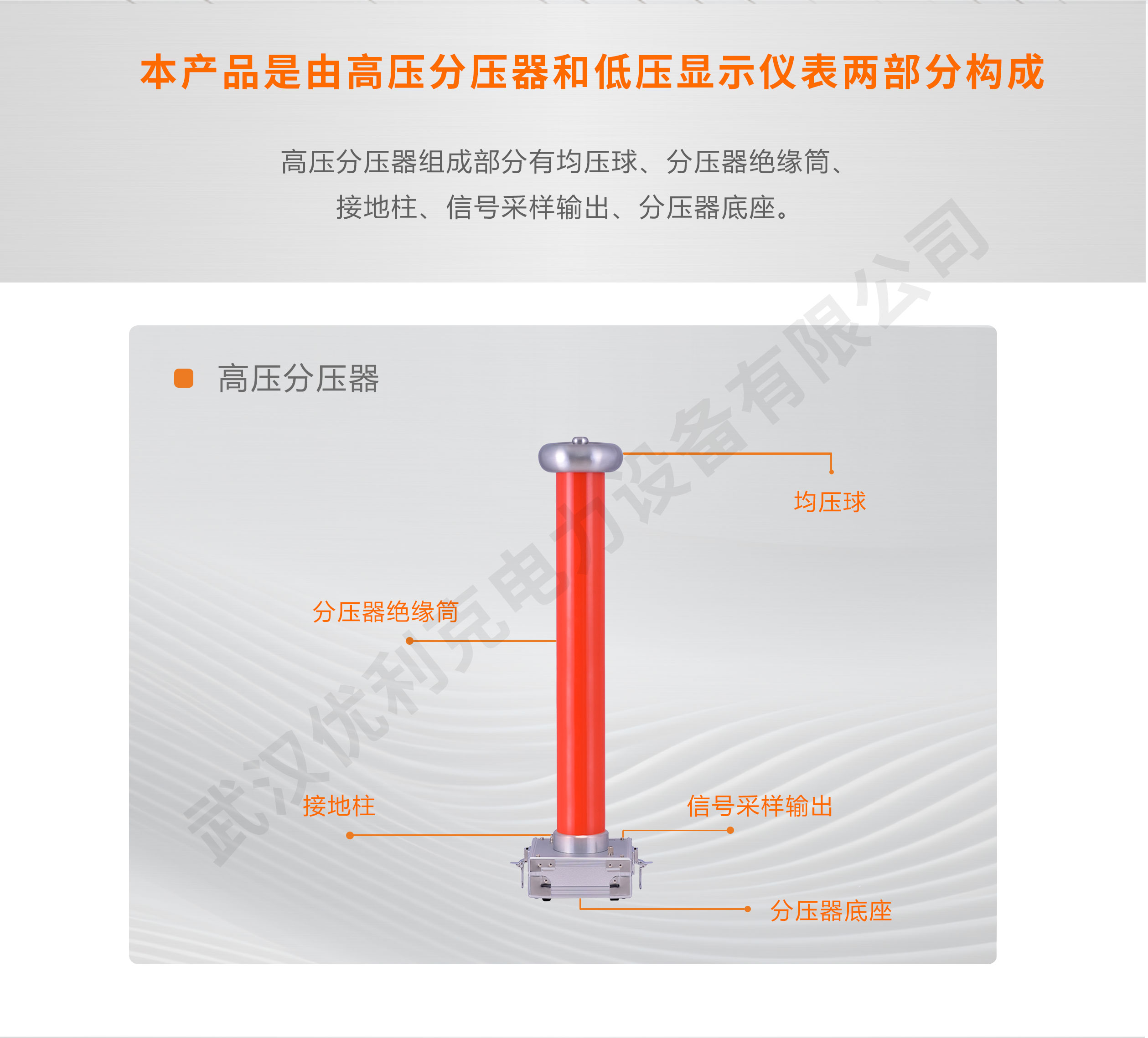 本儀器是由高壓分壓器和低壓顯示儀表構成,高壓分壓器采用美國杜邦填充材料,特種工藝灌封,結構更小,重量更輕,內部局部放電量降到最低,可靠性更高。不存在漏油問題。工作時高壓分壓器和低壓儀表采用同軸電纜連接,高低壓部分距離較遠,工作安全可靠。