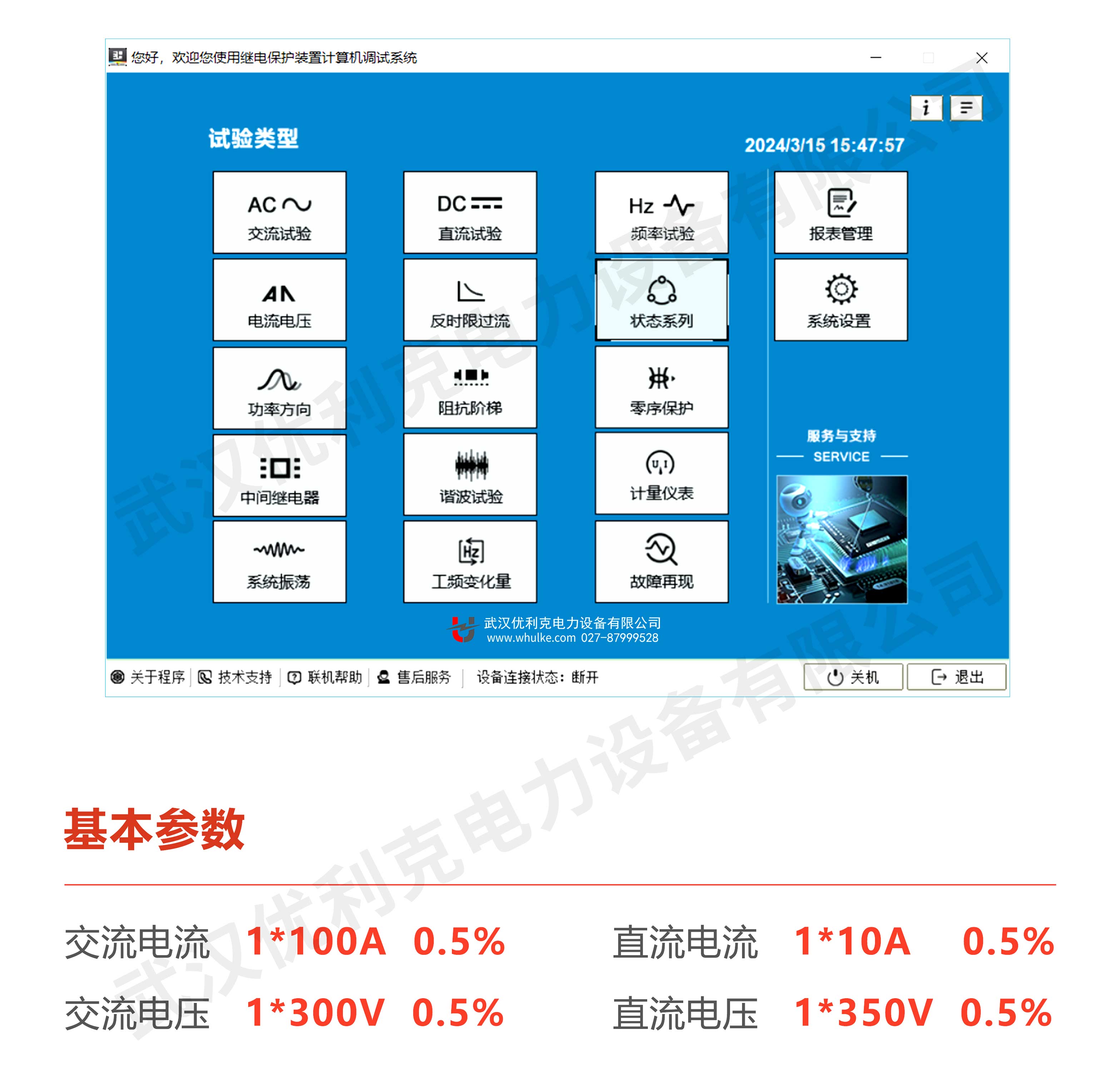 本儀器具有單相電壓,單相電流輸出,既可對(duì)傳統(tǒng)的各種繼電器及保護(hù)裝置進(jìn)行試驗(yàn),也可對(duì)現(xiàn)代各種微機(jī)保護(hù)進(jìn)行各種試驗(yàn)。主控板采用DSP+FPGA結(jié)構(gòu),16位DAC輸出,對(duì)基波可產(chǎn)生每周2000點(diǎn)的高密度正弦波,大大改善了波形的質(zhì)量,提高了測(cè)試儀的精度。功放采用高保真線性功放,既保證了小電流的精度,又保證了大電流的穩(wěn)定。USB接口直接和PC機(jī)通訊,無(wú)須任何轉(zhuǎn)接線,方便使用。