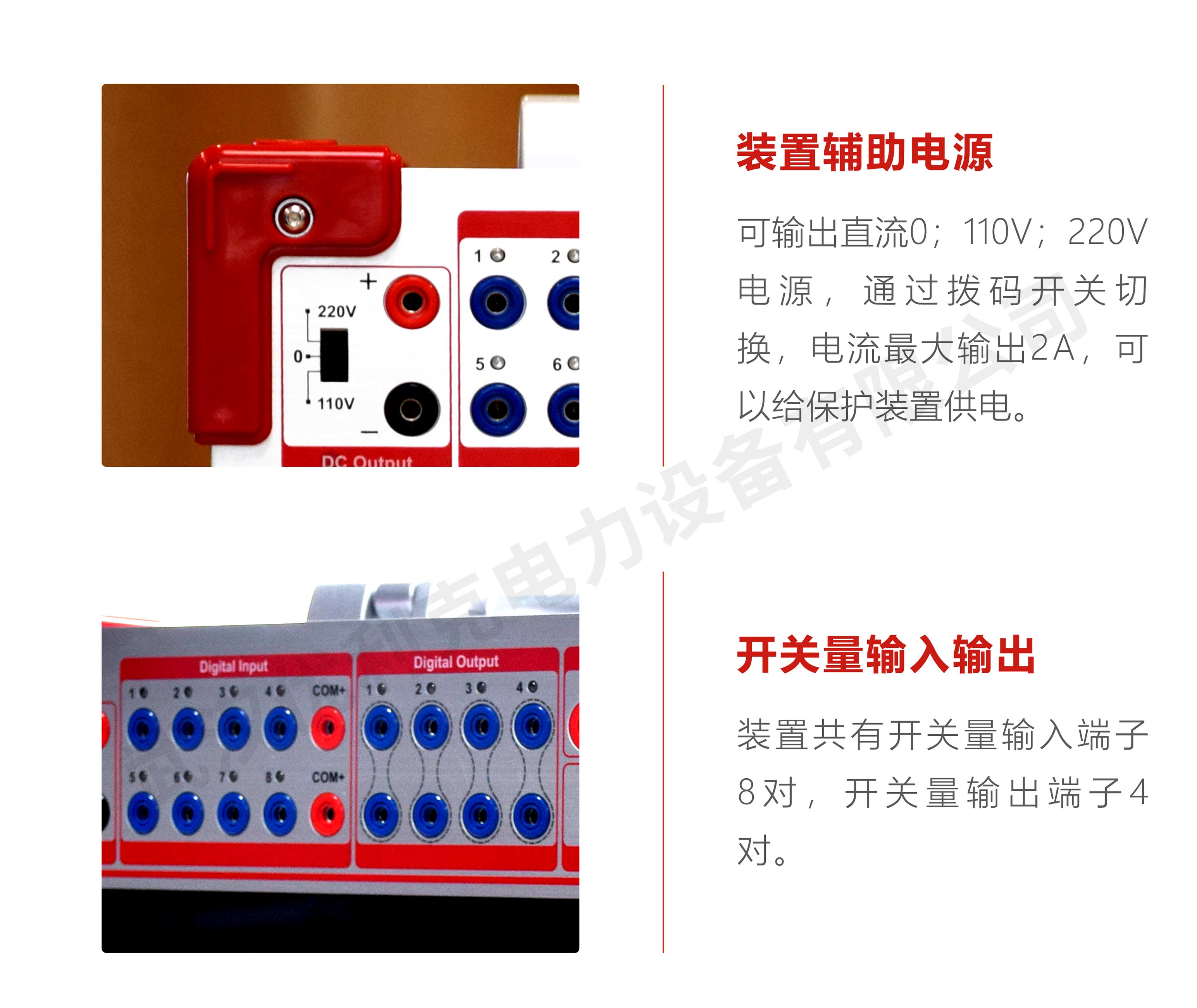 本設(shè)備配有獨(dú)立專用直流輔助電壓源輸出,輸出電壓分別為110V(1A),220V(0.6A)。以提供給需要直流工作電源的繼電器或保護(hù)裝置使用。
