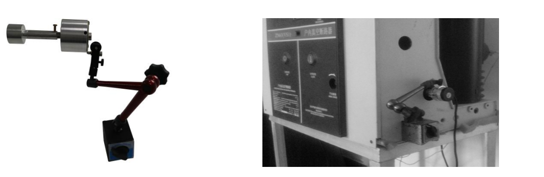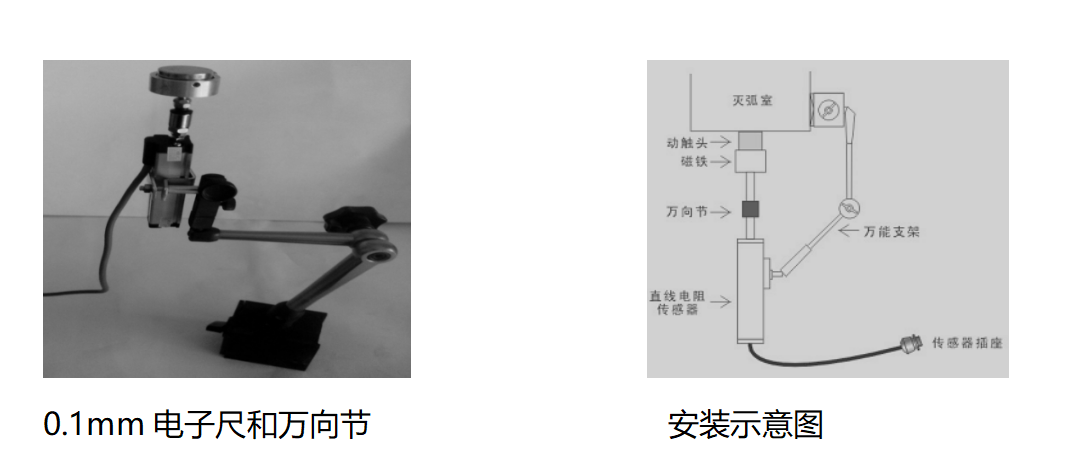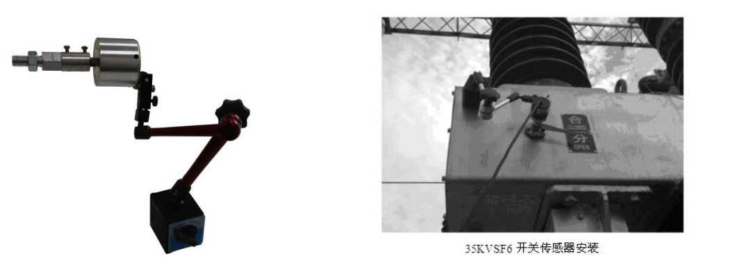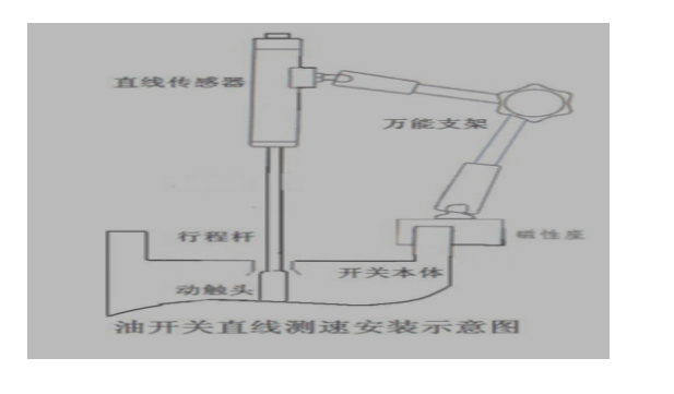 在測試開關(guān)速度時,先將直線傳感器安裝在高壓開關(guān)的動觸頭上。根據(jù)所測開關(guān)的類型油、真空、SF6,選擇相應(yīng)的傳感器安裝。