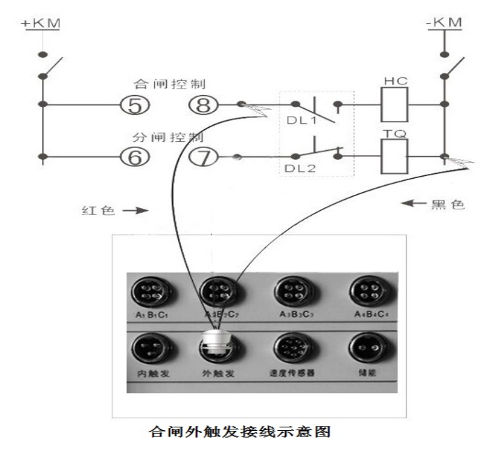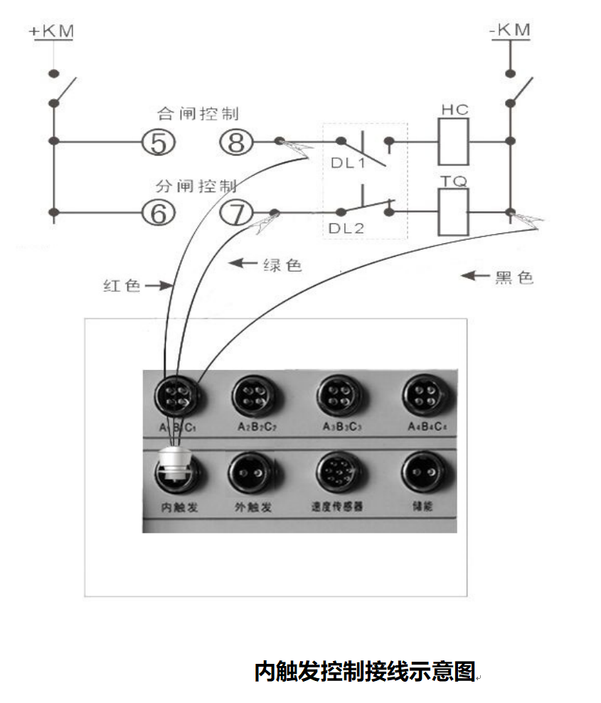 現(xiàn)場試驗時,如果采用儀器內(nèi)部電源,合閘控制線(紅色)、分閘控制線(綠色)、公共線(黑色)接入到儀器面板的“內(nèi)觸發(fā)”端口(航空插頭), 儀器 分+、合+、負 輸出時,一般須接在輔助開關(guān)接點前(可有效保護線圈和儀器)。接線時注意切斷斷路器裝置自有的操作電源(斷開刀鍘或者拔掉保險),以免兩種電源沖突,損壞儀器.