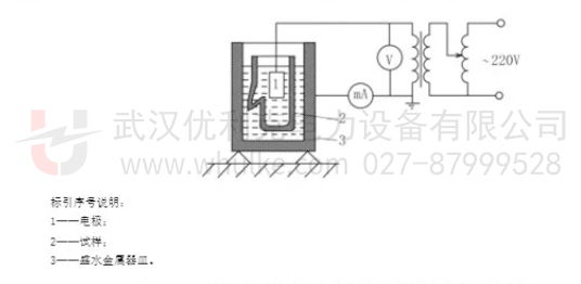 輔助型絕緣手套:將輔助型絕緣手套浸入盛有自來(lái)水的金屬器皿中,保持手套內(nèi)外水平面高度相同,套口邊緣露出水面 90mm±13mm 并擦干,逐漸升壓至表 27 規(guī)定值,保持規(guī)定時(shí)間,并測(cè)量泄漏電流,試驗(yàn)接線見(jiàn)下圖。