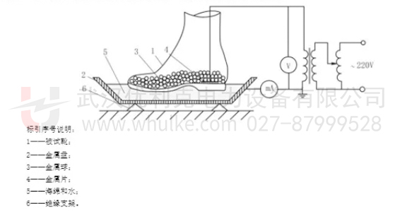 輔助型絕緣靴:外觀應(yīng)完好無(wú)損,鞋幫不應(yīng)開(kāi)膠,鞋底防滑齒不應(yīng)磨平、外底不應(yīng)磨透露出絕緣層等。試驗(yàn)應(yīng)無(wú)擊穿、閃絡(luò)現(xiàn)象,且泄漏電流不超過(guò)規(guī)定值,按 GB 21148 的規(guī)定進(jìn)行,試驗(yàn)接線見(jiàn)下圖 。