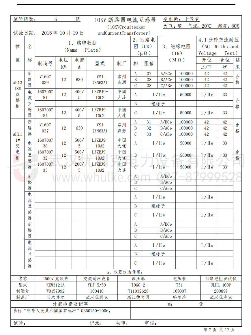 試驗(yàn)電壓、加壓時(shí)間、實(shí)測(cè)泄漏電流值;
