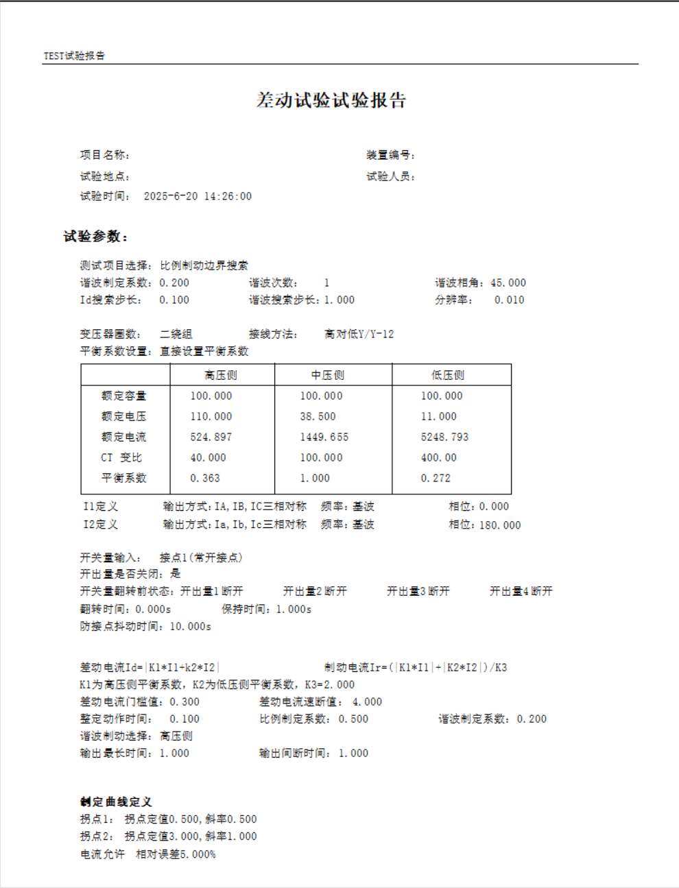詳細(xì)記錄試驗(yàn)過程中的各項(xiàng)數(shù)據(jù),包括不平衡電流測(cè)試數(shù)據(jù)、比率制動(dòng)特性測(cè)試數(shù)據(jù)、諧波制動(dòng)特性測(cè)試數(shù)據(jù)以及動(dòng)作時(shí)間測(cè)試數(shù)據(jù)