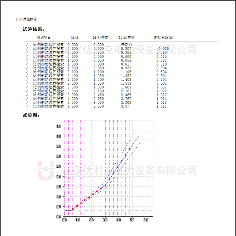 術(shù)說明書中給出的標(biāo)準(zhǔn)比率制動(dòng)特性曲線進(jìn)行對(duì)比,兩者應(yīng)基本吻合。誤差范圍一般要求在 ±5% 以內(nèi),例如,如果標(biāo)準(zhǔn)曲線在某一